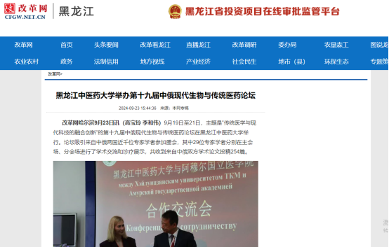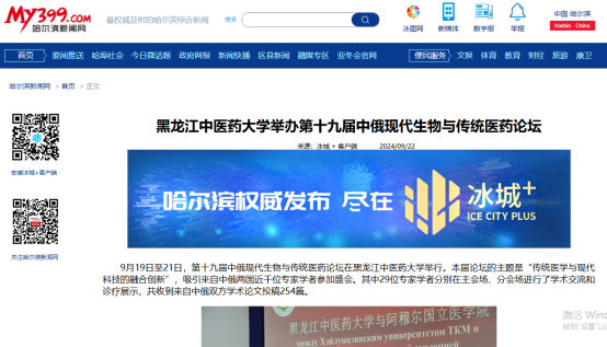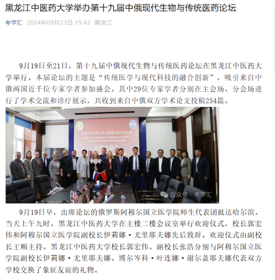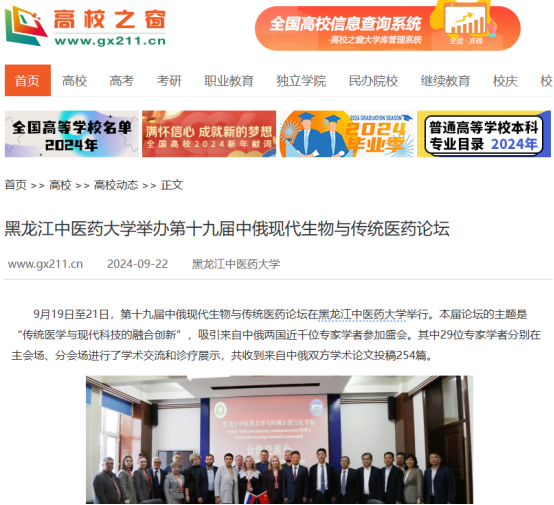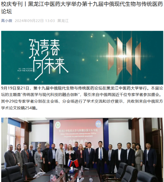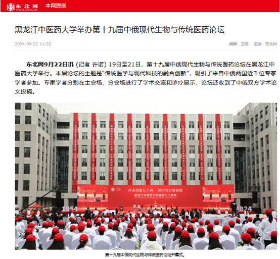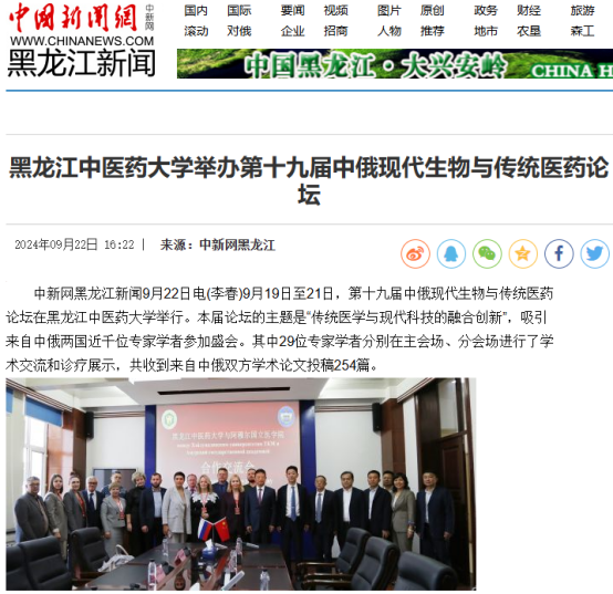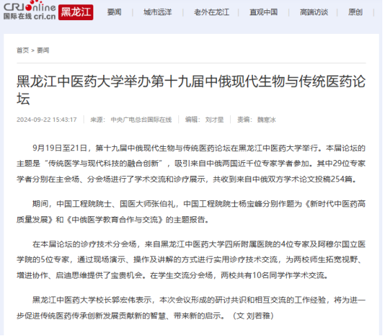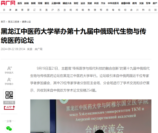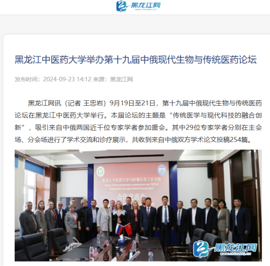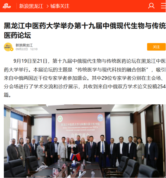 9月19日至21日,第十九届中俄现代生物与传统医药论坛在黑龙江中医药大学举行。论坛得到国际在线、中国日报、央广网、中国新闻网、东北网、黑龙江网、改革网、哈尔滨新闻网、新浪新闻、高校之窗、黑龙江高校广播、考学汇等12家媒体的关注和报道。