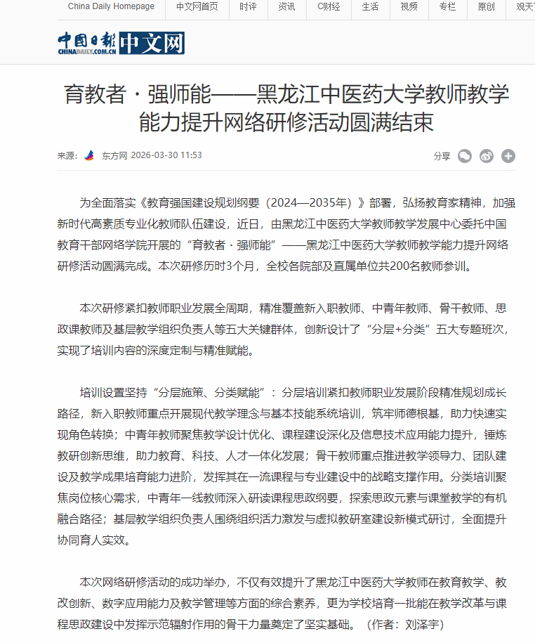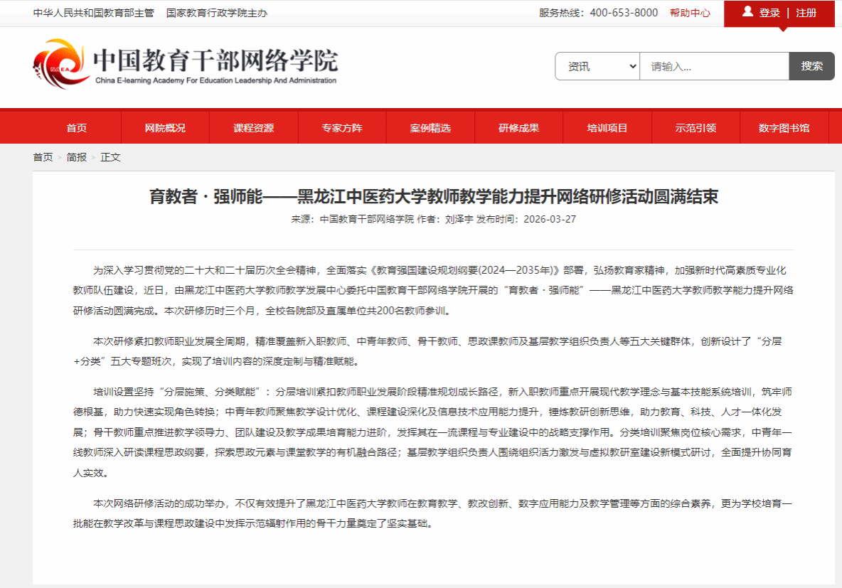 为深入学习贯彻党的二十大和二十届历次全会精神,全面落实《教育强国建设规划纲要(2024—2035年)》部署,弘扬教育家精神,加强新时代高素质专业化教师队伍建设,学校教师教学发展中心联合中国教育干部网络学院开展的“育教者・强师能”——黑龙江中医药大学教师教学能力提升网络研修活动近期完成。