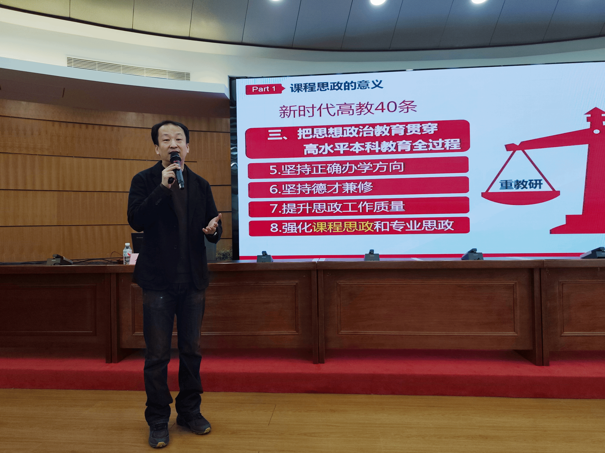金虎教授从课程思政的育人意义出发,围绕落实立德树人根本任务,系统阐述了课程思政的时代背景、核心理念、实施路径与项目申报要点,构建了从理论到实践的完整认知体系与行动框架。他清晰梳理了课程思政的设计逻辑,深入讲解了不同学科思政元素的挖掘方法,并结合自身教学经验,分享了如何将思政教育自然融入课堂教学的实用策略。讲座结束后,金教授同参会教师就课程思政实践中的相关问题进行了深入交流与分享。