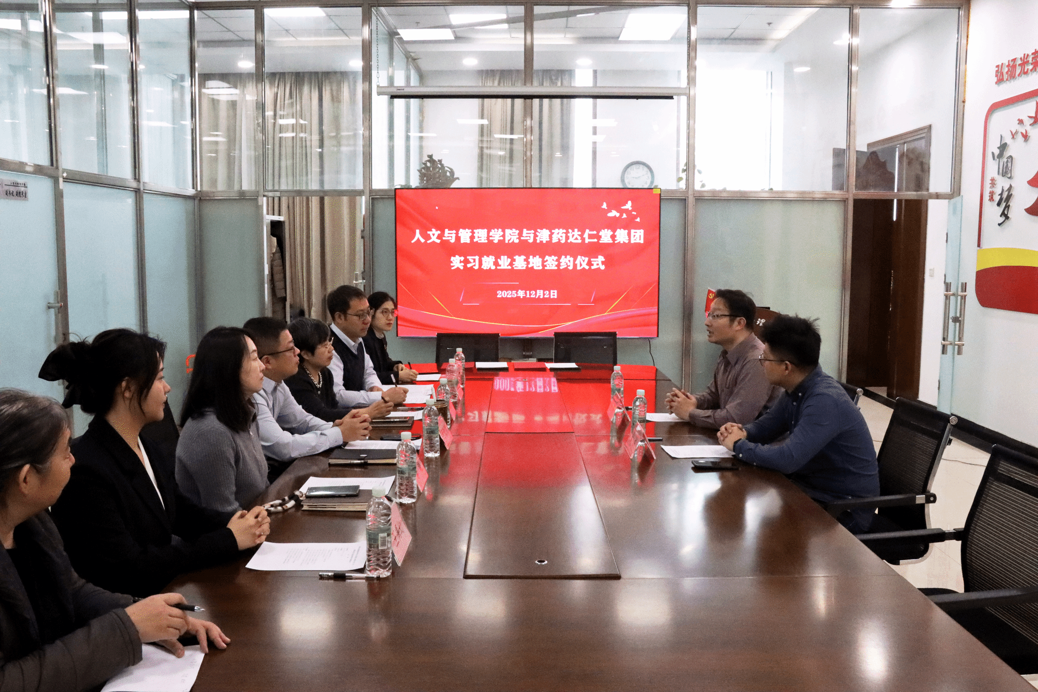 12月2日,人文与管理学院与津药达仁堂集团股份有限公司举行共建实习就业基地签约仪式。津药达仁堂集团股份有限公司营销招聘负责人东北华北分公司人力资源部门负责人彭建、东北分公司大区市场经理张洪,学院领导班子、毕业班辅导员及专业负责人共同出席签约授牌仪式,双方就人才培养、实习就业、实践教学等议题达成合作意向。