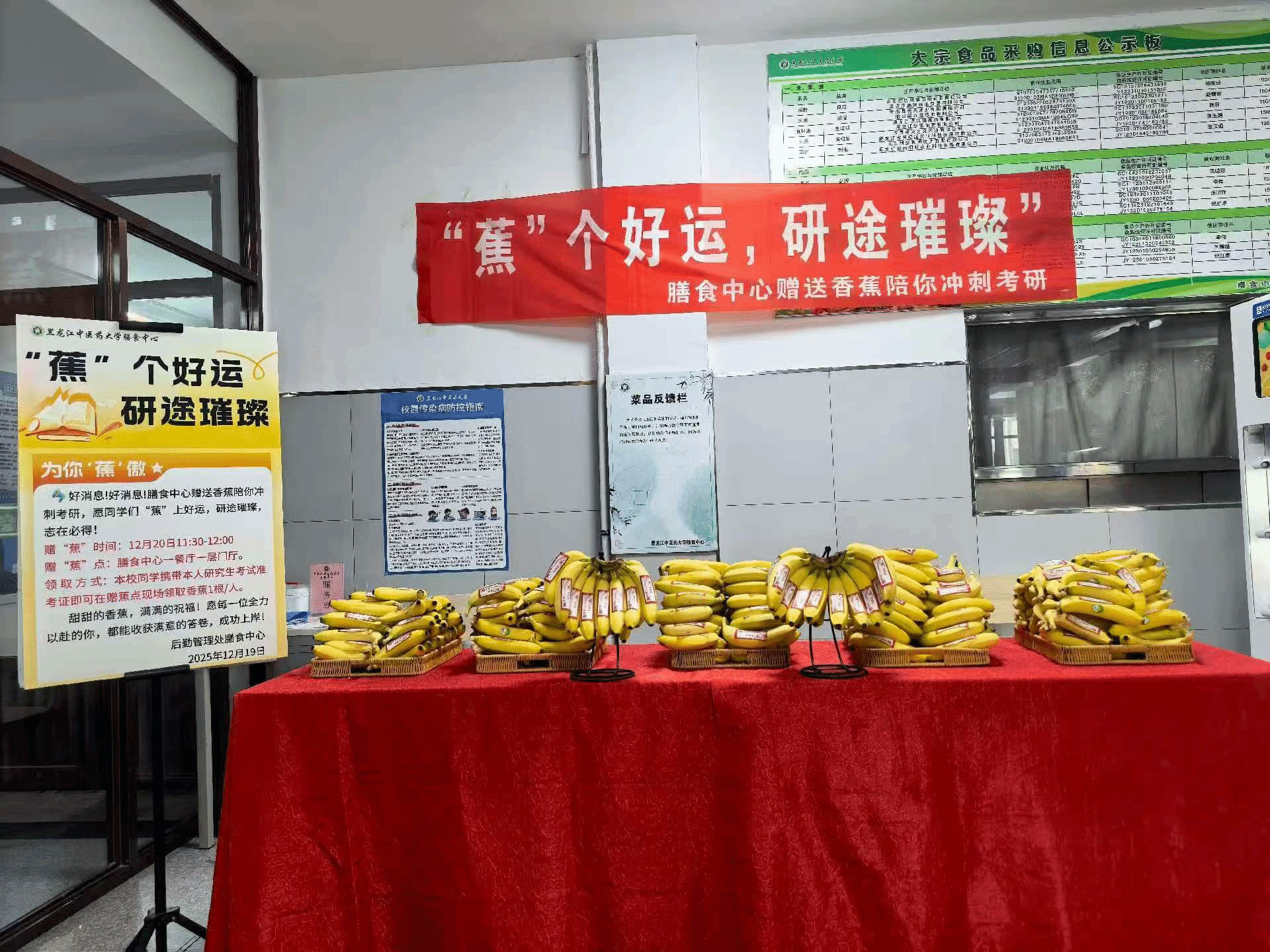 为坚定学生的考试信心,缓解考试压力,传递温暖力量,膳食中心在考研当日为400余名考研学子赠送香蕉,寓意“蕉”个好运,缓解考场压力,甜甜的香蕉承载满满的祝福,传递着校园温暖。