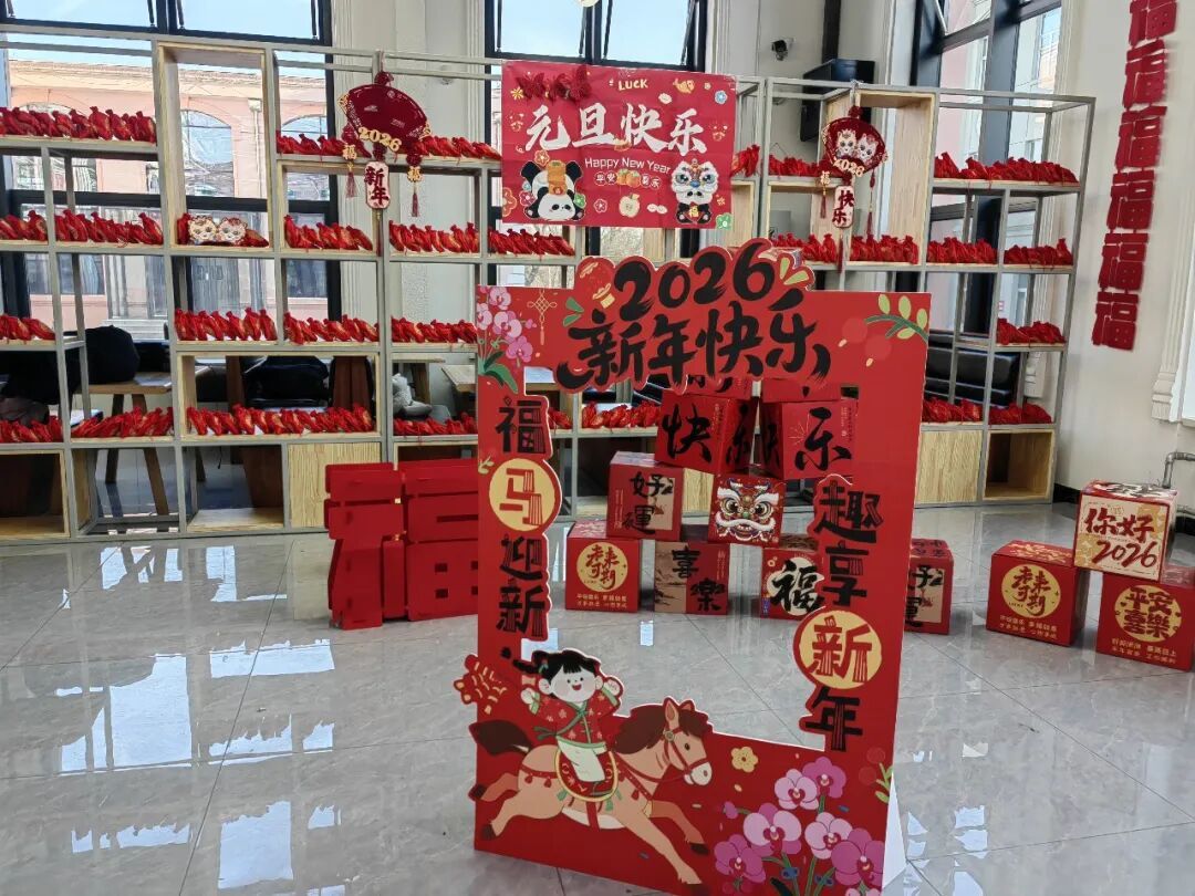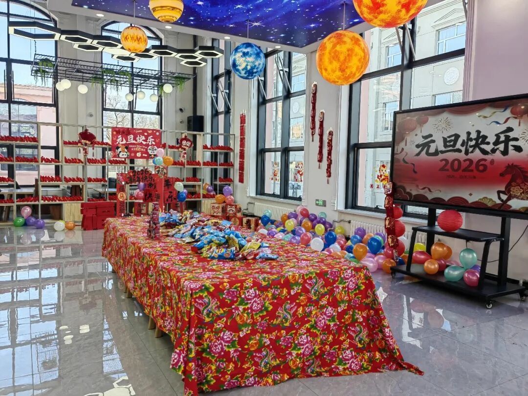 食堂大厅以喜庆的中国红为主色调,东北特色的红花布铺满长桌,桌上整齐码放着零食、糖果。各色的游戏道具、五彩气球将节日氛围拉满。电子大屏播放“2026元旦快乐”马年主题画面,合影打卡区的红灯笼、中国结营造出浓厚年味。