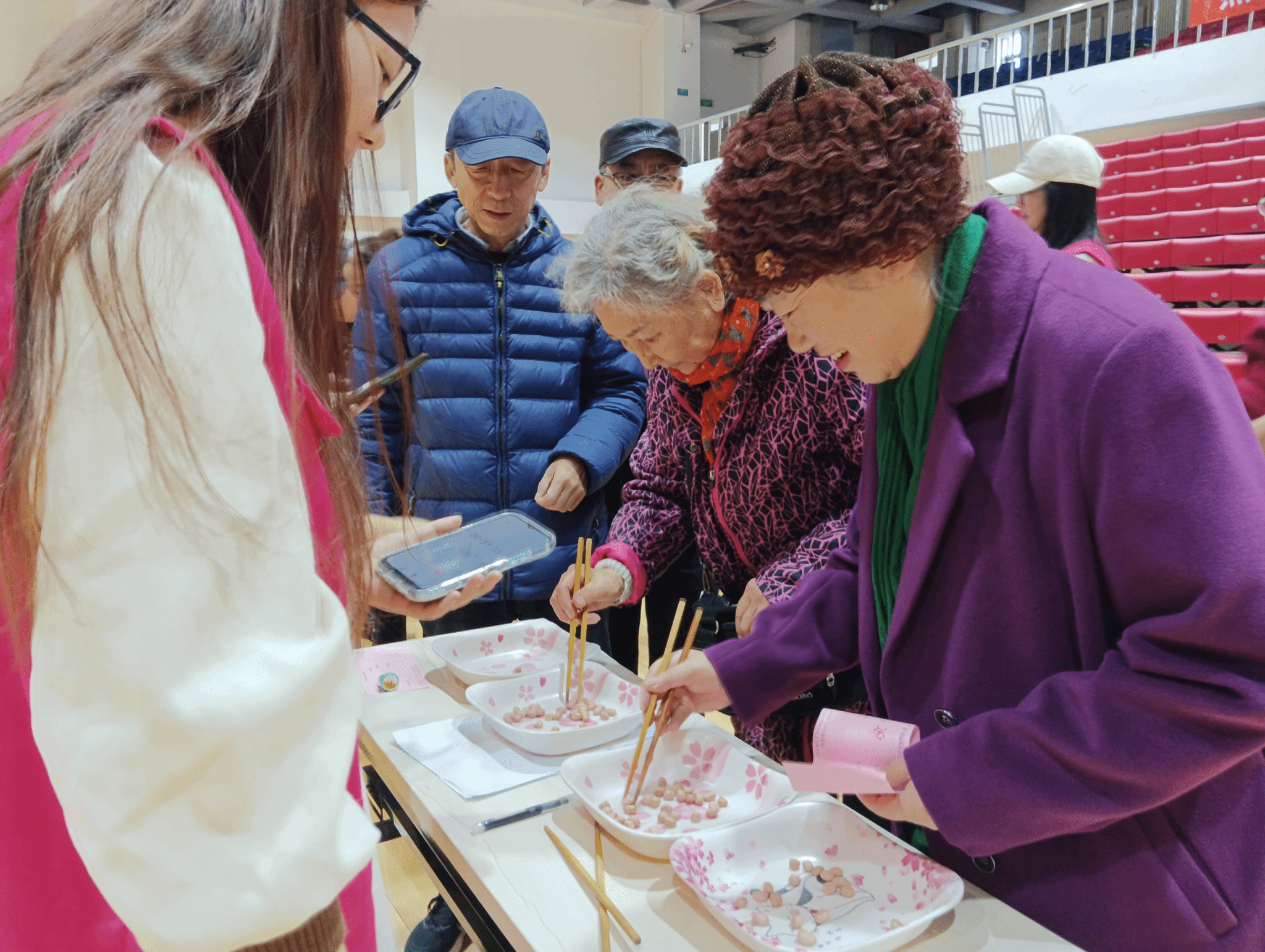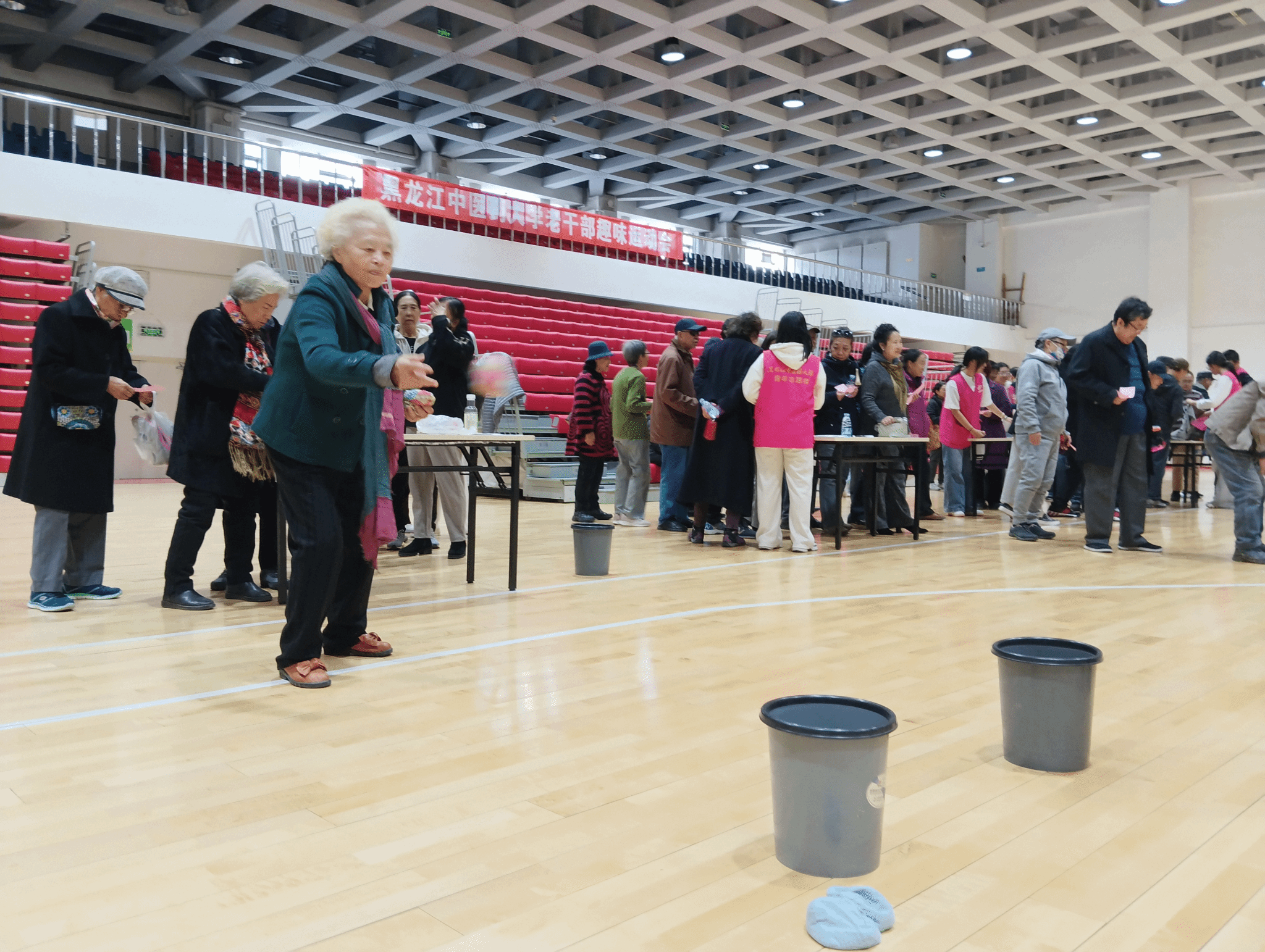离退休工作处人员和青年志愿者在赛前布置好场地,营造浓厚重阳节节日气氛。本次趣味运动会充分考虑老同志们的身体特点和兴趣爱好,设置了套圈游戏、筷子夹豆子、“保龄球”大作战、记忆比拼、丢沙包等集趣味性、安全性于一体的比赛项目。