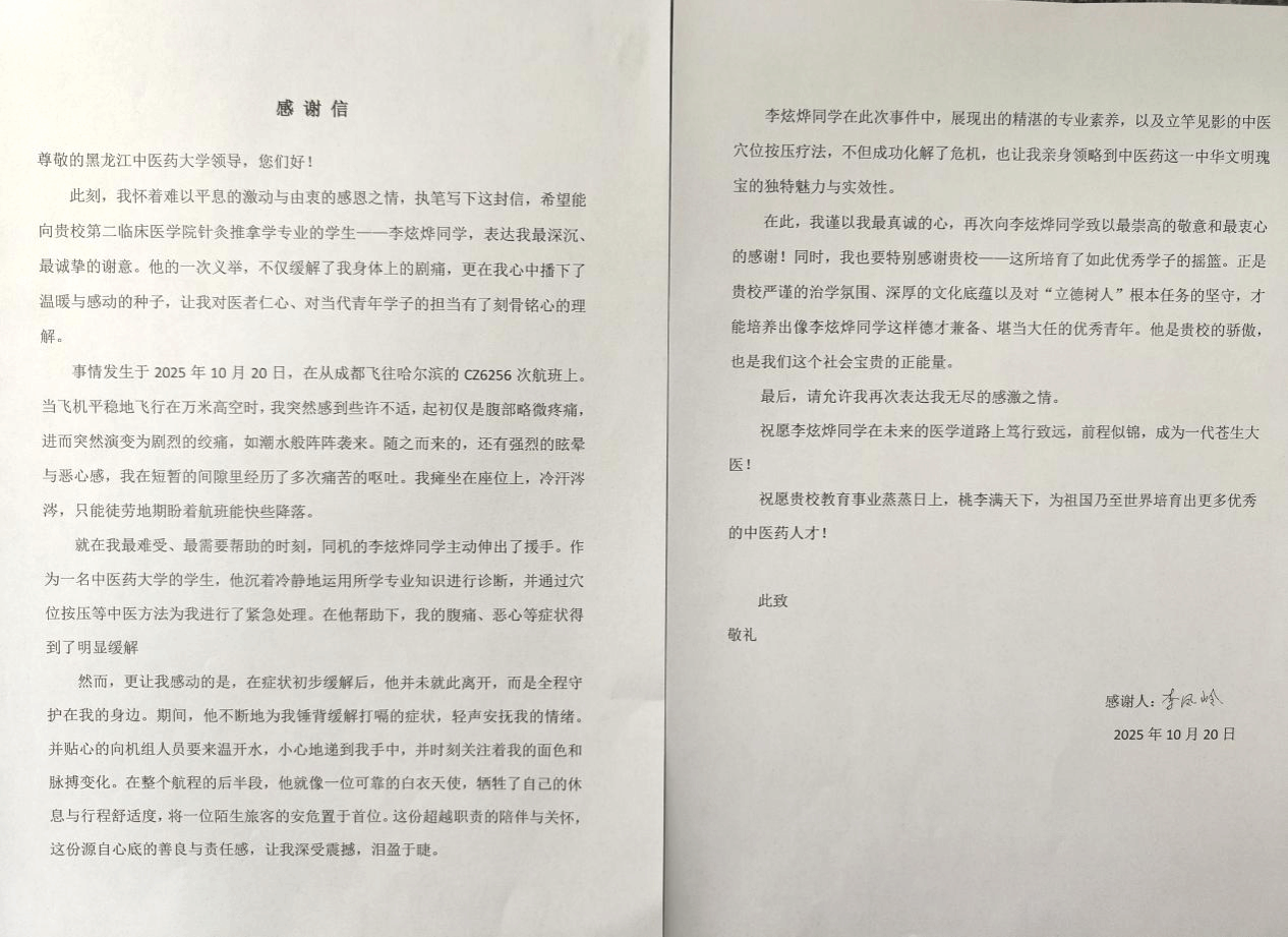 2025年10月,两名来自黑龙江中医药大学第二临床医学院的学生,运用所学中医知识,分别成功救助了在飞机飞行过程中突发身体不适的旅客。