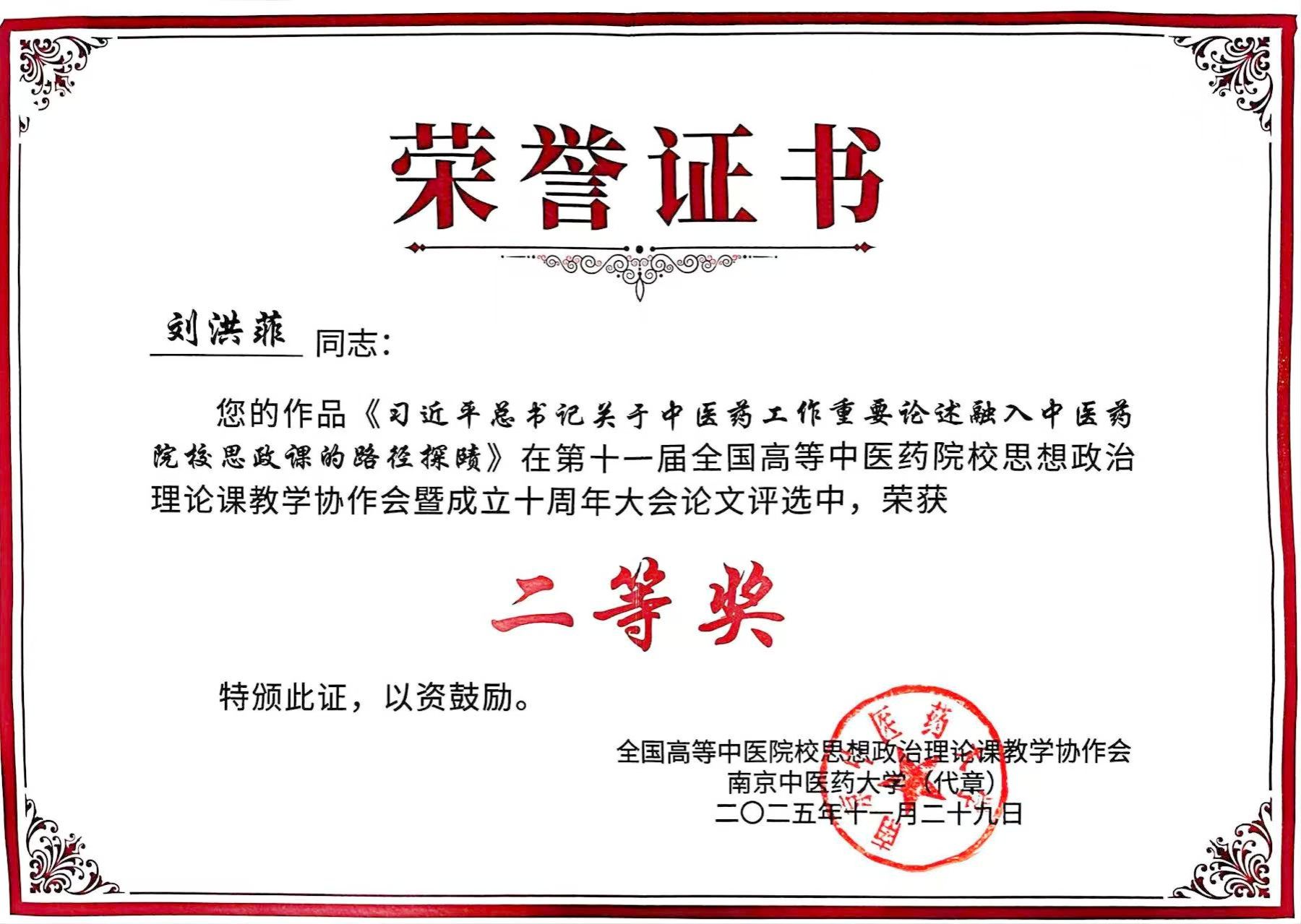 马克思主义学院教师杨溢的论文《中国式现代化视域下中医药传承创新发展的路径探析》在大会论文评选中荣获特等奖。