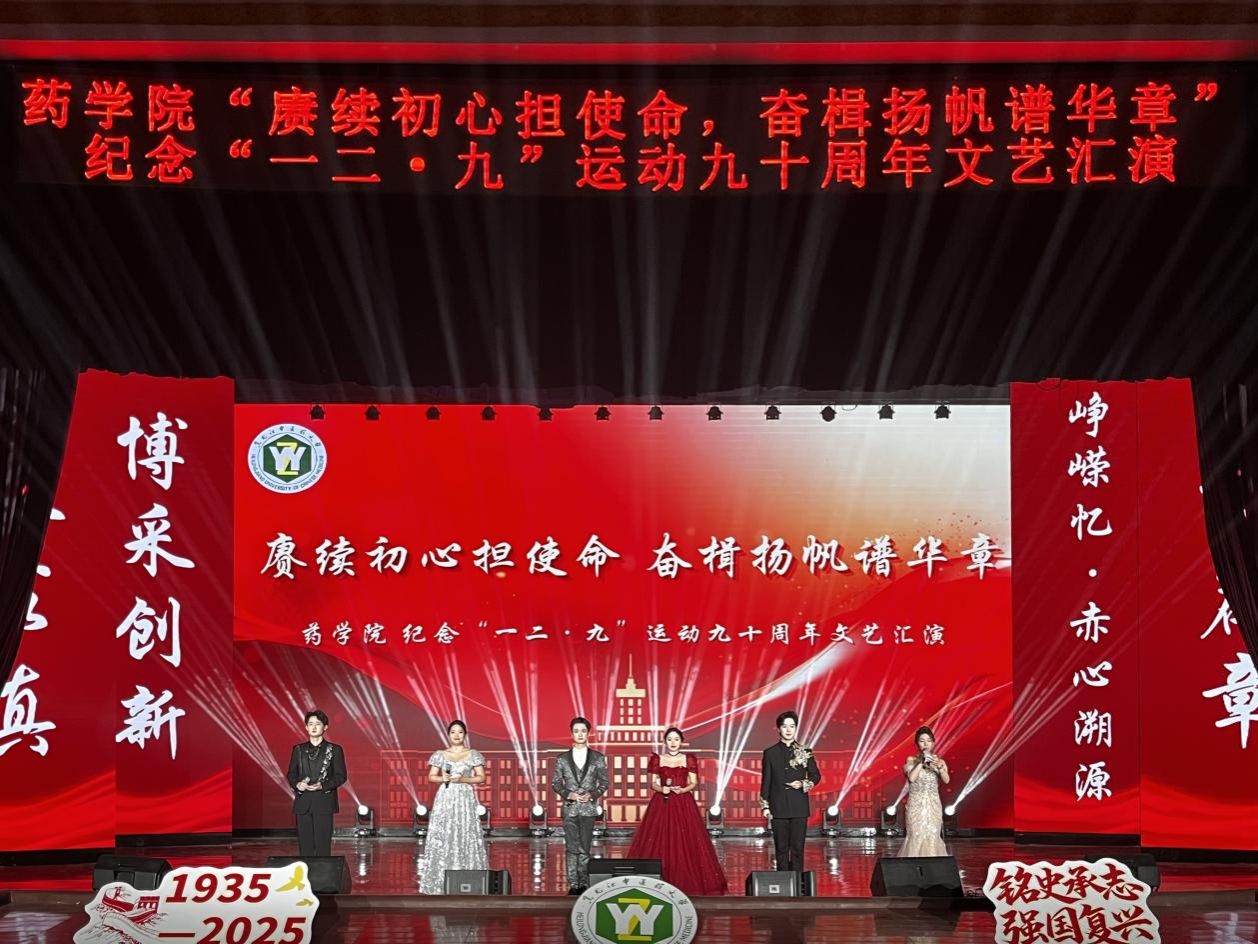 12月12日晚,药学院“赓续初心担使命,奋楫扬帆谱华章”纪念“一二·九”运动九十周年文艺汇演在主楼礼堂举行。校党委副书记、工会主席乔广霞,校党委常委、副校长吴修红,各相关职能部门负责人,各学院主管学生工作领导,药学院党政领导班子及药学院学生工作办公室全体人员出席活动。