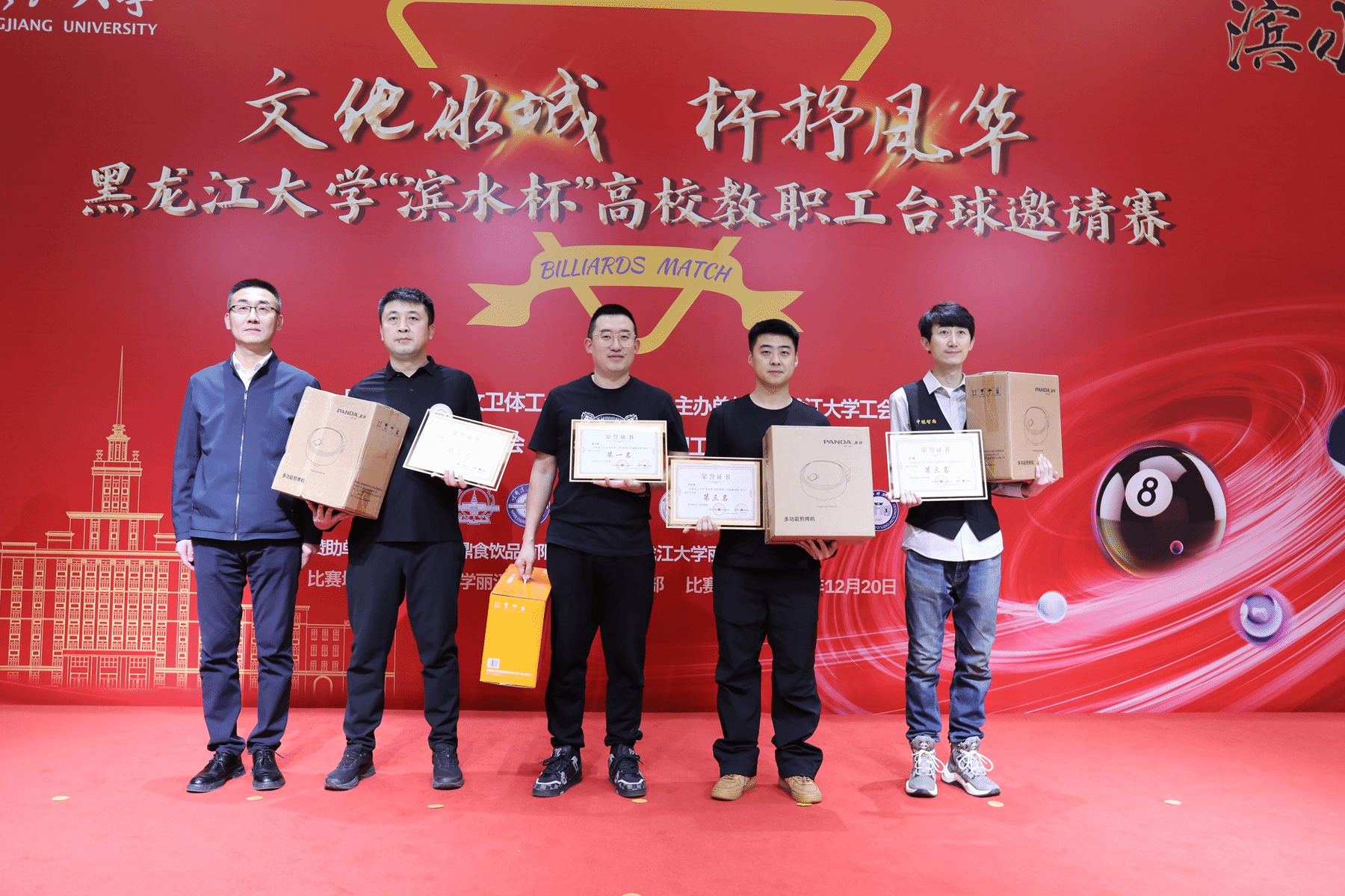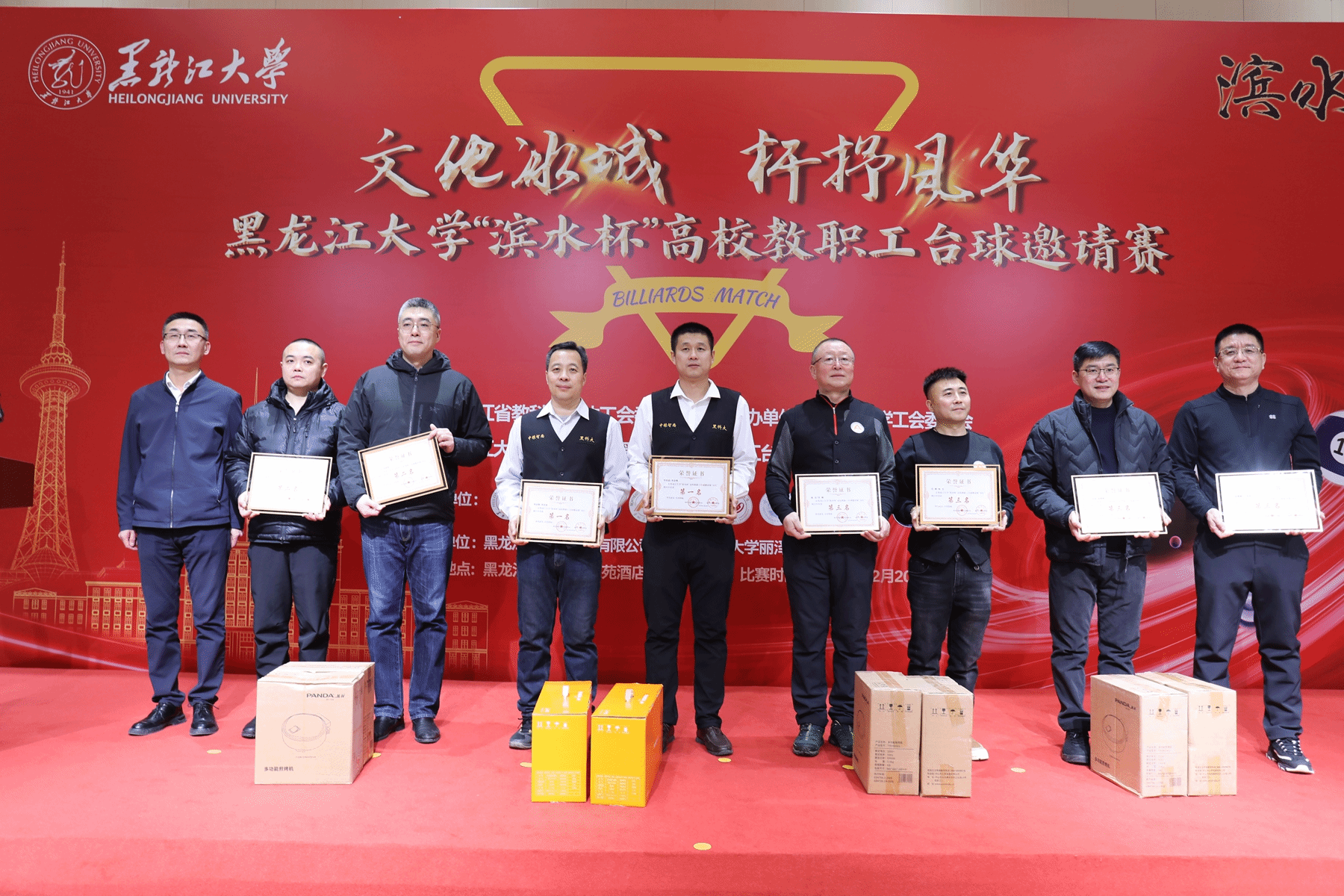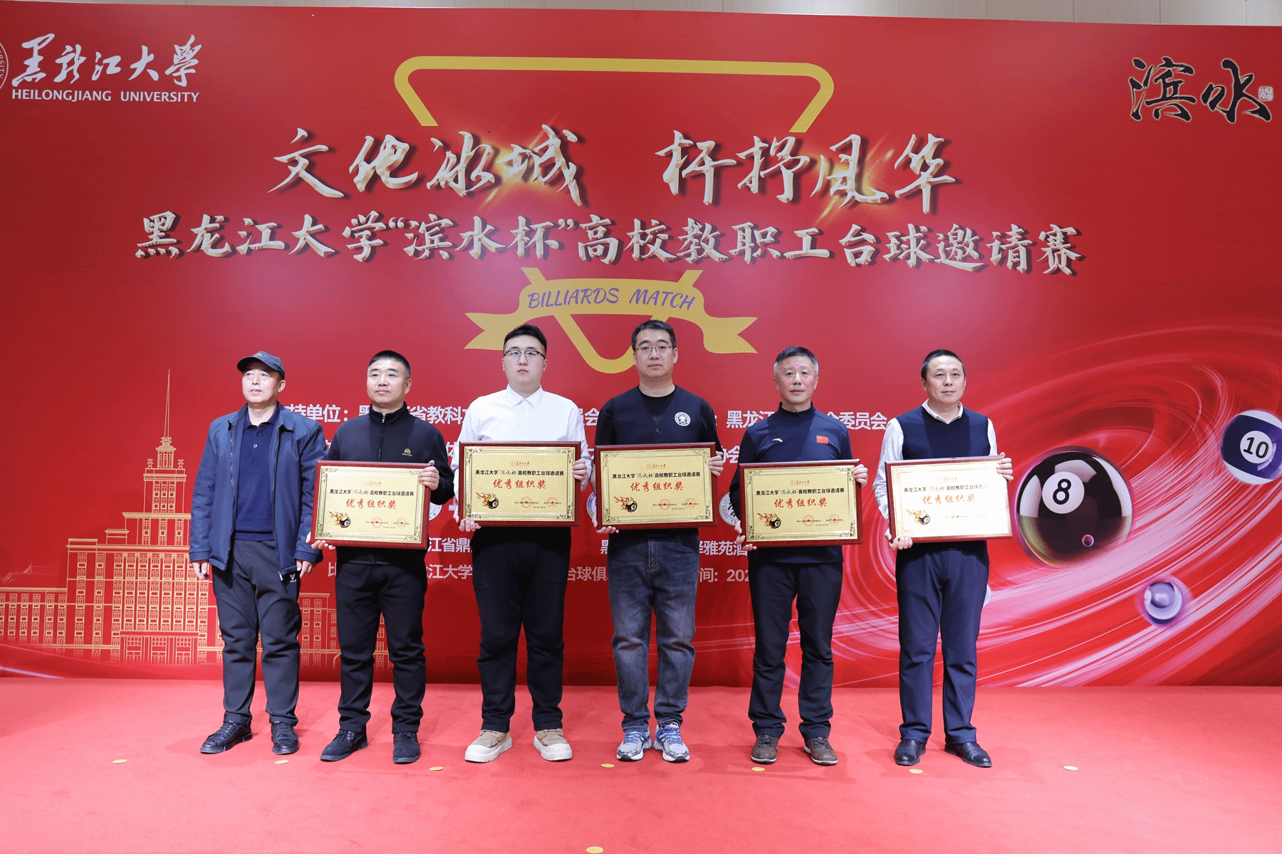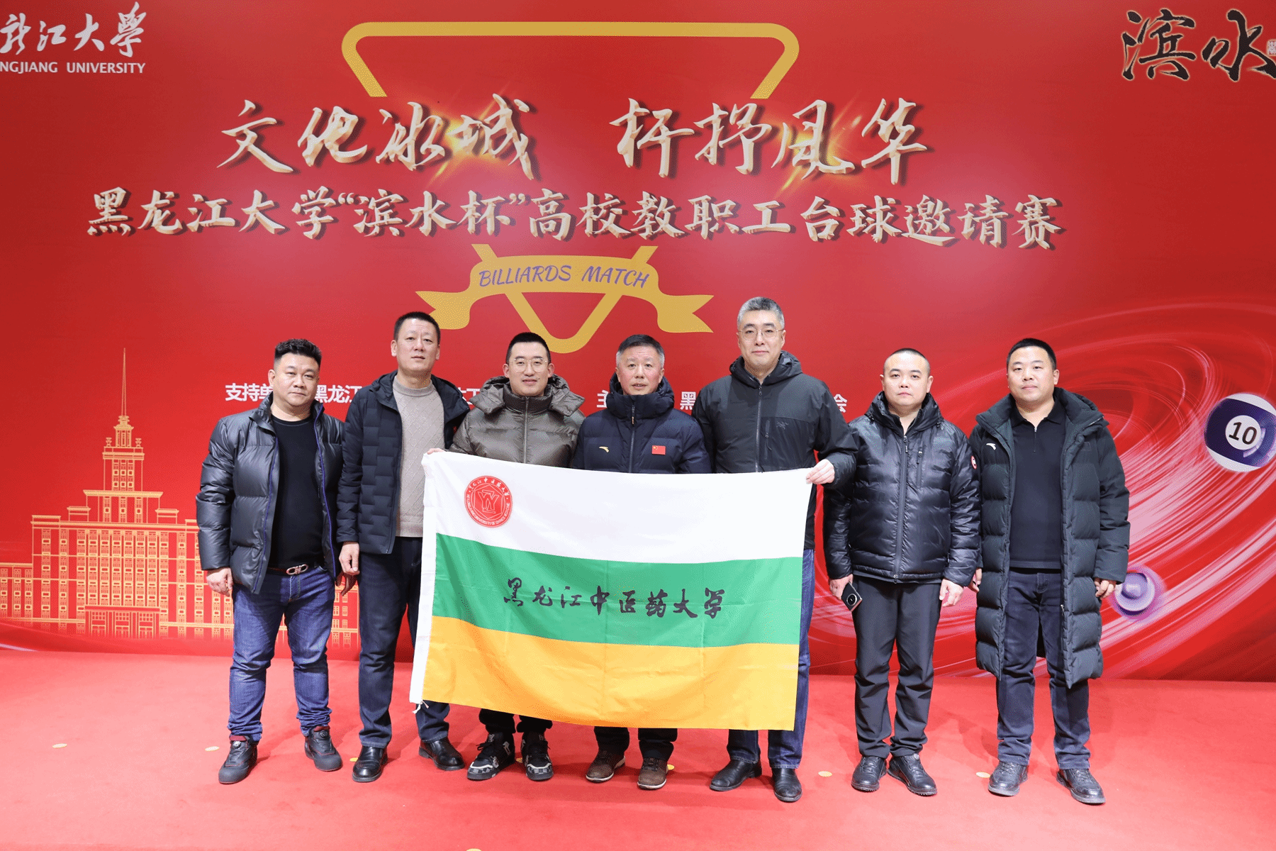 12月20日,由黑龙江省教科文卫体工会委员会支持、黑龙江大学工会委员会主办的2025“滨水杯”高校教职工台球邀请赛在黑龙江大学举行。我校作为受邀单位派出9名教职工组成代表队参赛,校工会常务副主席王晓鹏担任领队。