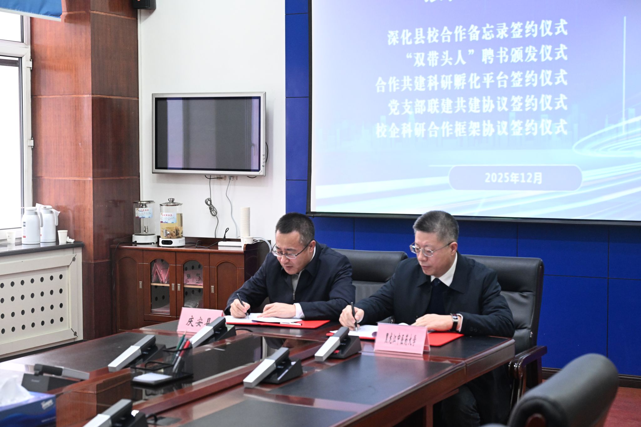 随后,庆安县与我校共同签订县校合作备忘录,并为“双带头人”刘艳、耿乃志教授颁发“县级顾问”聘书;县工信局与药学院签约共建科研孵化平台,县中医医院院直党支部与第一临床医学院二内党支部达成联建协议,黑龙江鑫乐泰农林科技有限公司与刘艳教授签订科研合作框架协议。