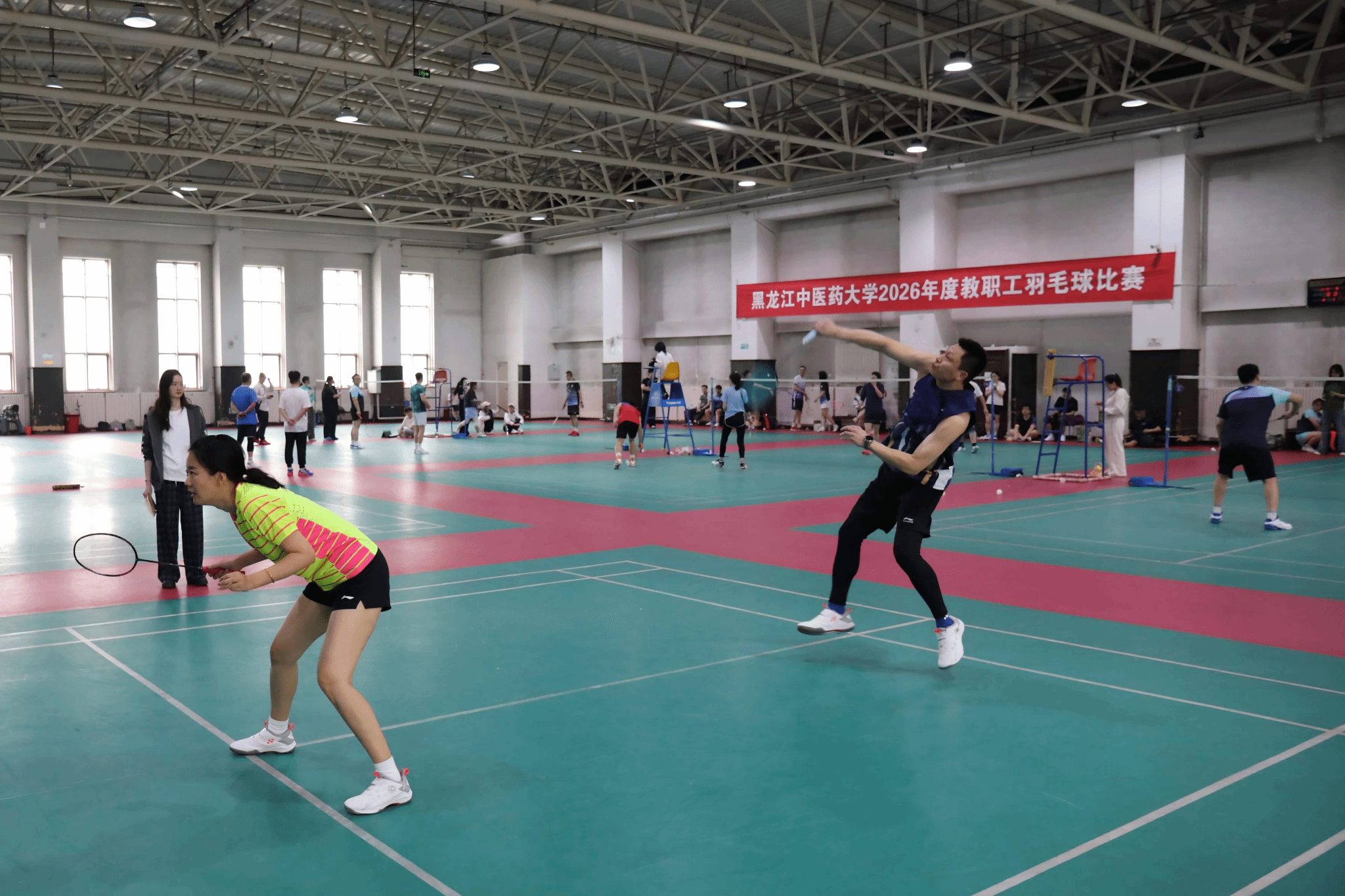 为丰富教职工文化体育生活,推动学校全民健身运动深入开展,3月25日至26日,学校在体育馆五楼羽毛球馆举办2026年度教职工羽毛球比赛,校党委副书记、工会主席乔广霞,校党委常委、副校长吴修红,校工会常务副主席王晓鹏到场观赛并为获奖选手颁奖。