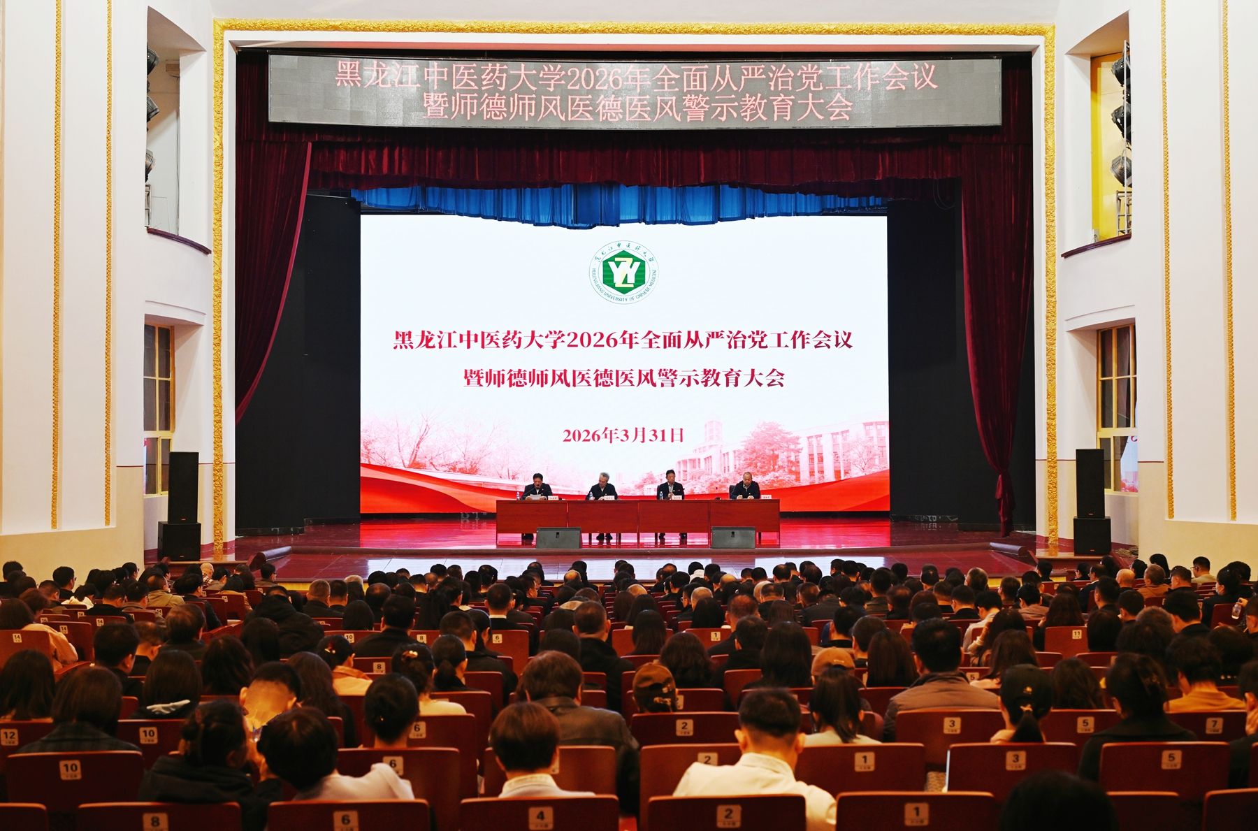 3月31日下午,学校召开2026年全面从严治党工作会议暨师德师风医德医风警示教育大会,深入学习贯彻习近平总书记关于党的建设的重要思想和关于党的自我革命的重要思想,全面落实中央纪委五次全会、省纪委五次全会和全省教育系统全面从严治党暨深化教育领域腐败整治工作动员部署会精神,总结2025年党风廉政建设工作成效,部署2026年全面从严治党重点工作。学校党委书记赵炜明讲话,校党委副书记、校长郭宏伟主持会议,校党委副书记尹占军传达习近平在中央纪委五次全会上的重要讲话精神、李希所作的工作报告精神和许勤在省纪委五次全会上的讲话精神、边学文所作的工作报告精神以及全省教育系统全面从严治党暨深化教育领域腐败整治工作动员部署会精神,省纪委监委驻校纪检监察组组长栾树森通报2025年派驻监督工作情况和案件处置情况。学校党政领导班子成员,处科级干部,教工党支部书记,业务科室主任、副主任(护士长)、辅导员、纪检干部参加会议。