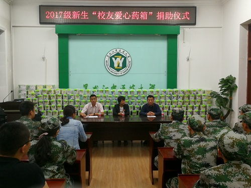 9月5日下午,我校2017级新生“校友爱心药箱”捐助仪式在主楼104室举行。多家我校校友所在企业为正在军训的2017级新生提供总价值近6万元的常用药品。