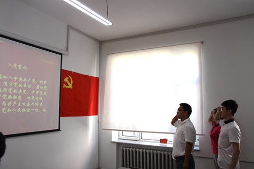7月14日上午,国际教育学院第一批学生党员光荣加入中国共产党,面对党旗庄严宣誓。2015级中西医临床医学(联办)专业门奕年、李睿两位学生党员面对党旗,接受心灵的特殊洗礼,并表示要严格要求自己,时刻保持共产党员的先进性,发挥先锋模范作用,努力使自己成为一名优秀的共产党员。