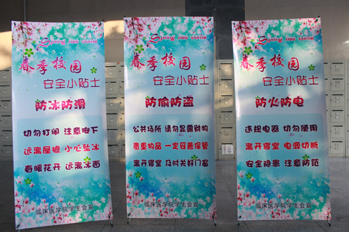 该院还制作了“春季校园安全小贴士”专题宣传板、“强化防火用电管理 增强安全防范意识”宣传条幅和“注意脚下路滑”、“注意坠冰”等温馨提示牌,分别在学生公寓楼下、学生二食堂门前和新教学楼圆厅等地进行悬挂和摆放,提醒同学们时刻加强校园安全意识,注意“防火防电”、“防偷防盗”和“防冰防滑”。